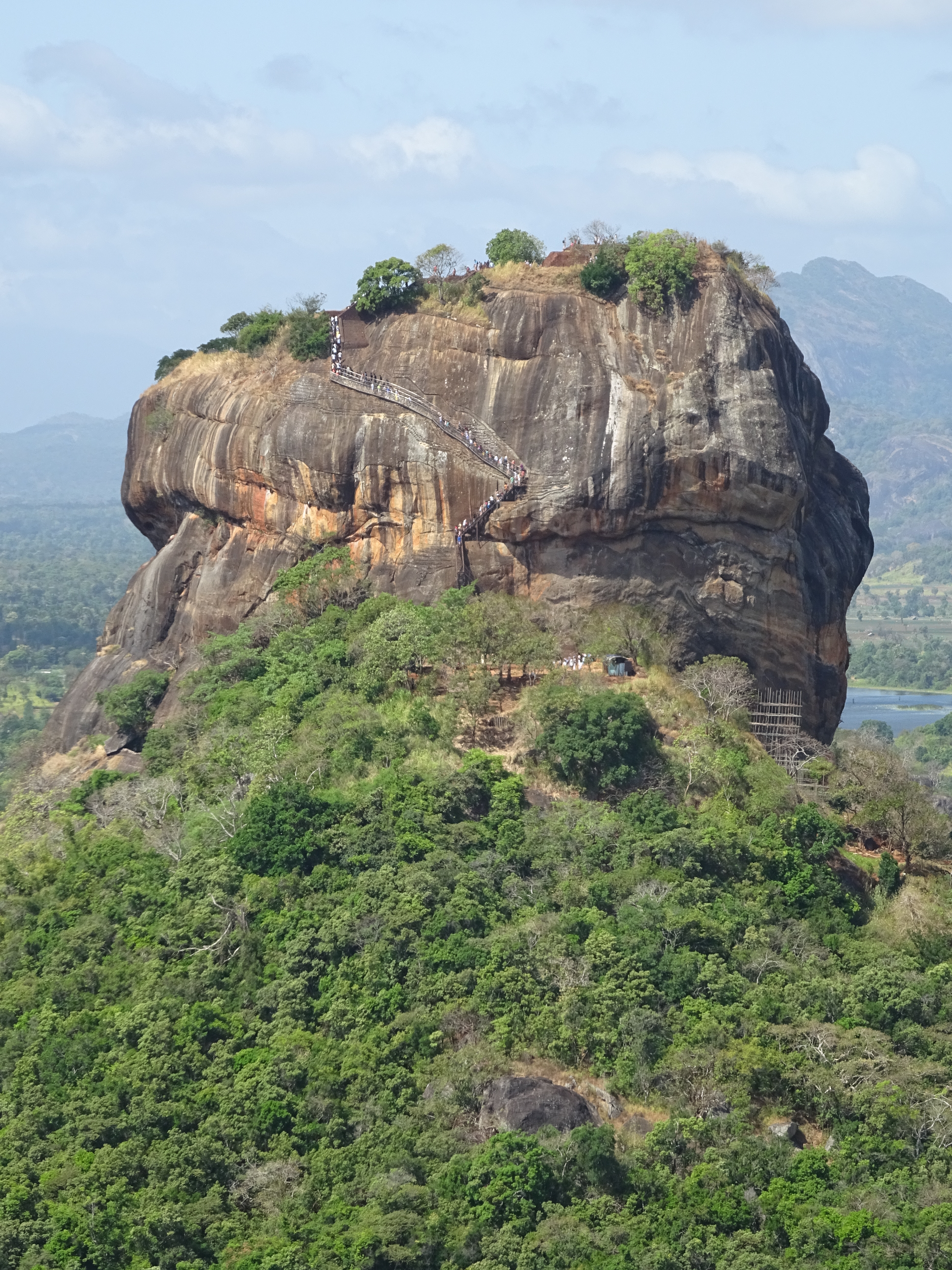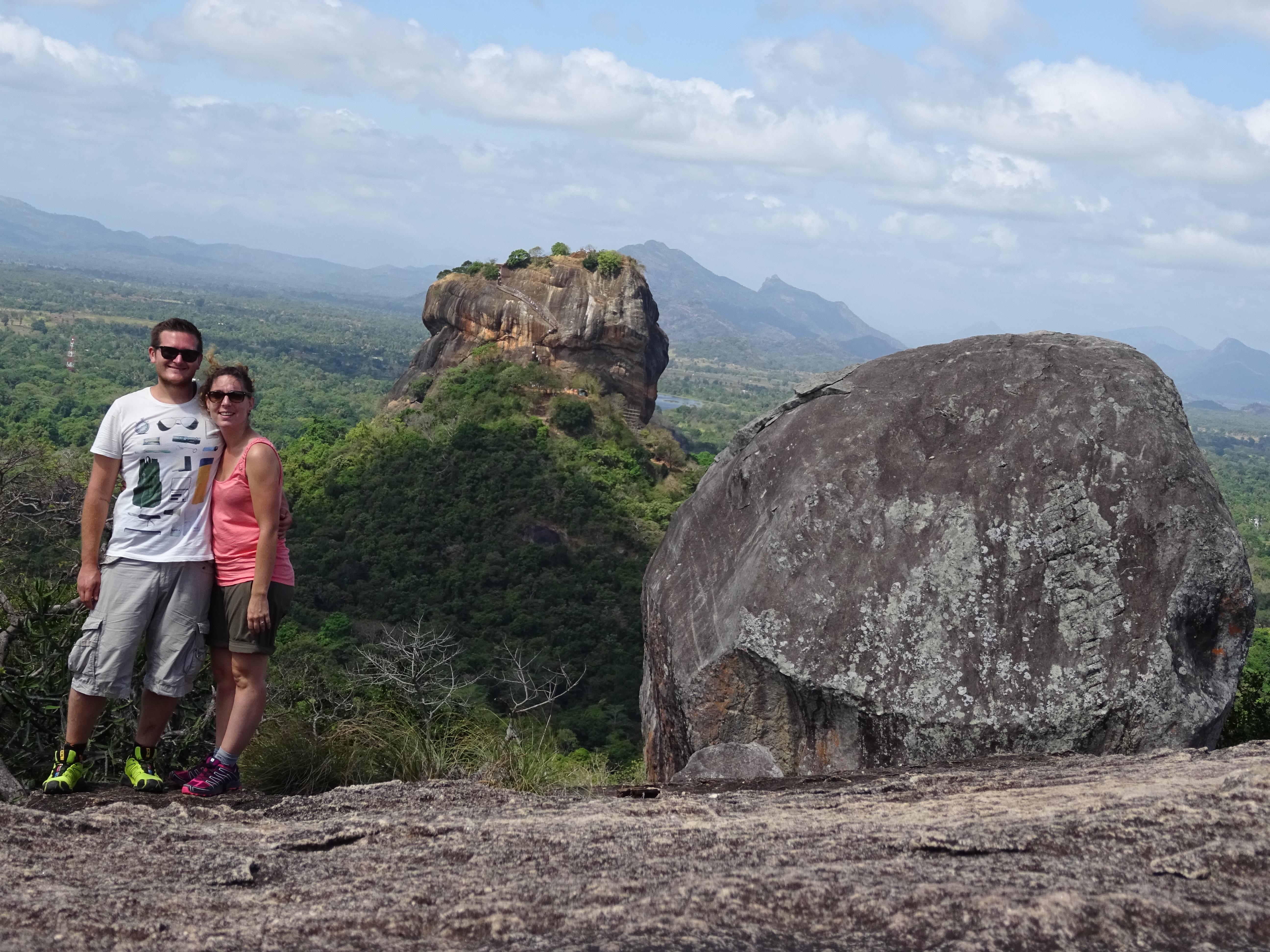 L’après-midi est consacrée à rejoindre Sigirya et donc à prendre plusieurs bus et à en attendre sous un soleil de plomb (premier coup de soleil pour Seb) jusqu’à ce qu’un arrive et ne soit pas le bon d’après le chauffeur… On ne perd pas patience et on arrive enfin à Sigirya dans une super auberge où le boss nous loge dans une chambre flambant neuve car d’après lui on est le couple parfait pour l’inaugurer !!! On passe la soirée avec 9 autres français et au fil des discussions on décide de changer notre futur itinéraire car en tant que bons aventuriers on voulait descendre au sud sans avoir regardé la météo et c’est la mauvaise saison alors que sur la côte Est le climat est idéal ! Notre étape à Sigirya était prévu pour grimper au sommet du Lion’s rock et grâce à un allemand qui nous a conseillé la veille un autre chemin on monte au petit rock et là haut on est seuls, on peut admirer le Lion’s rock et on a payé moitié moins cher !!!