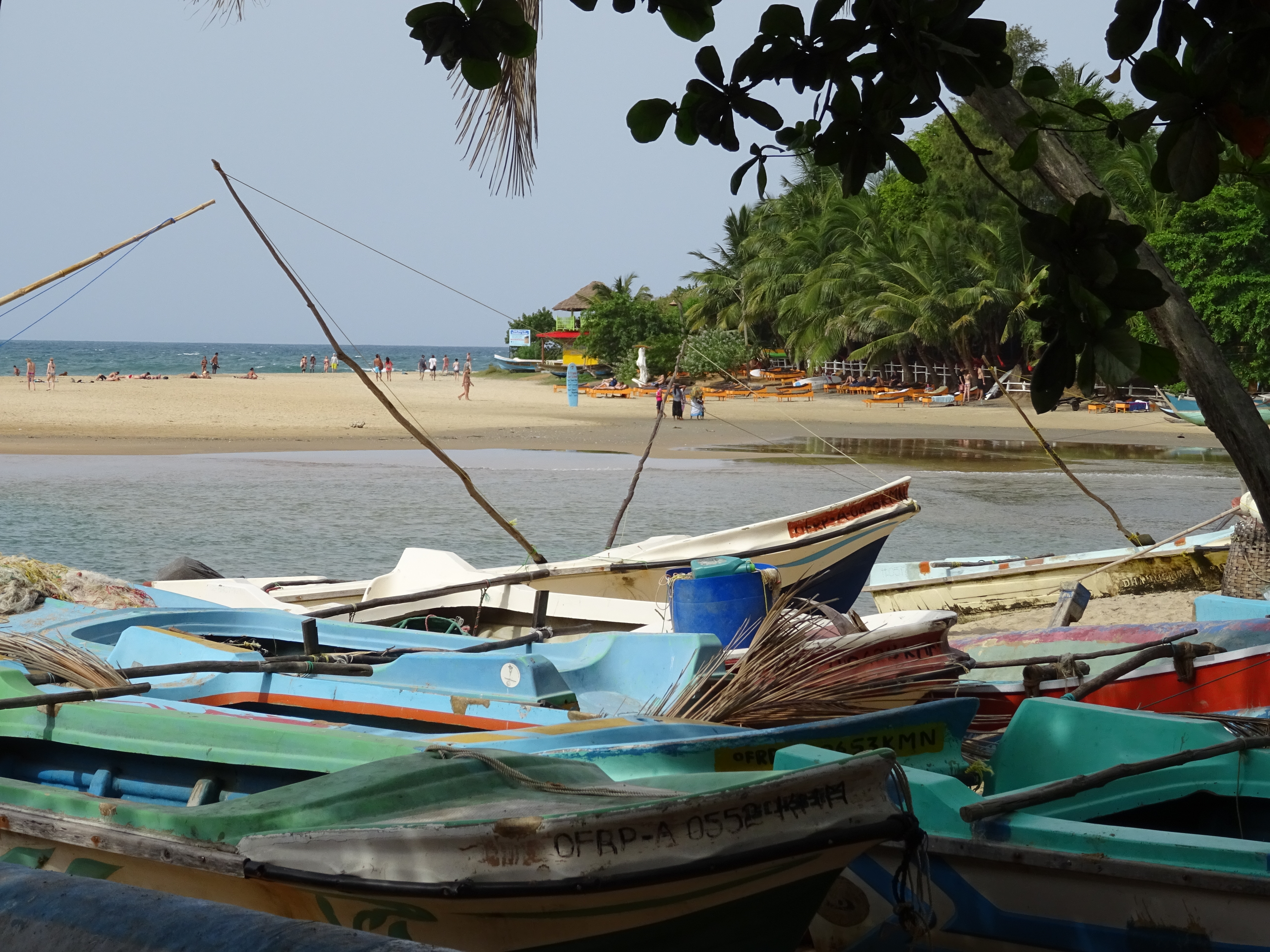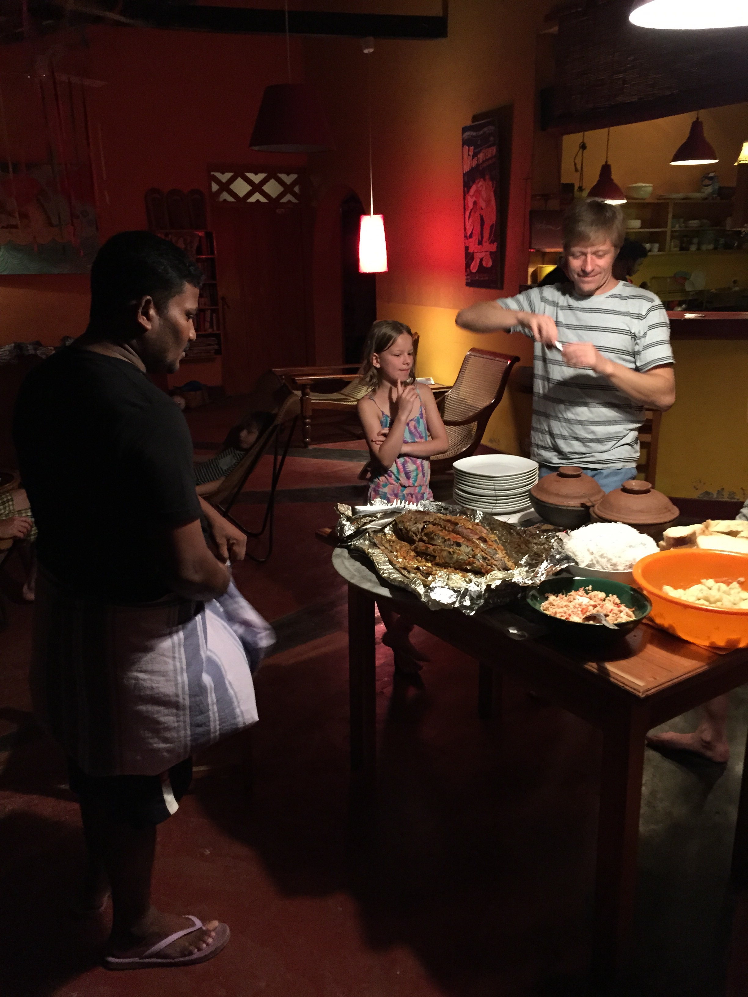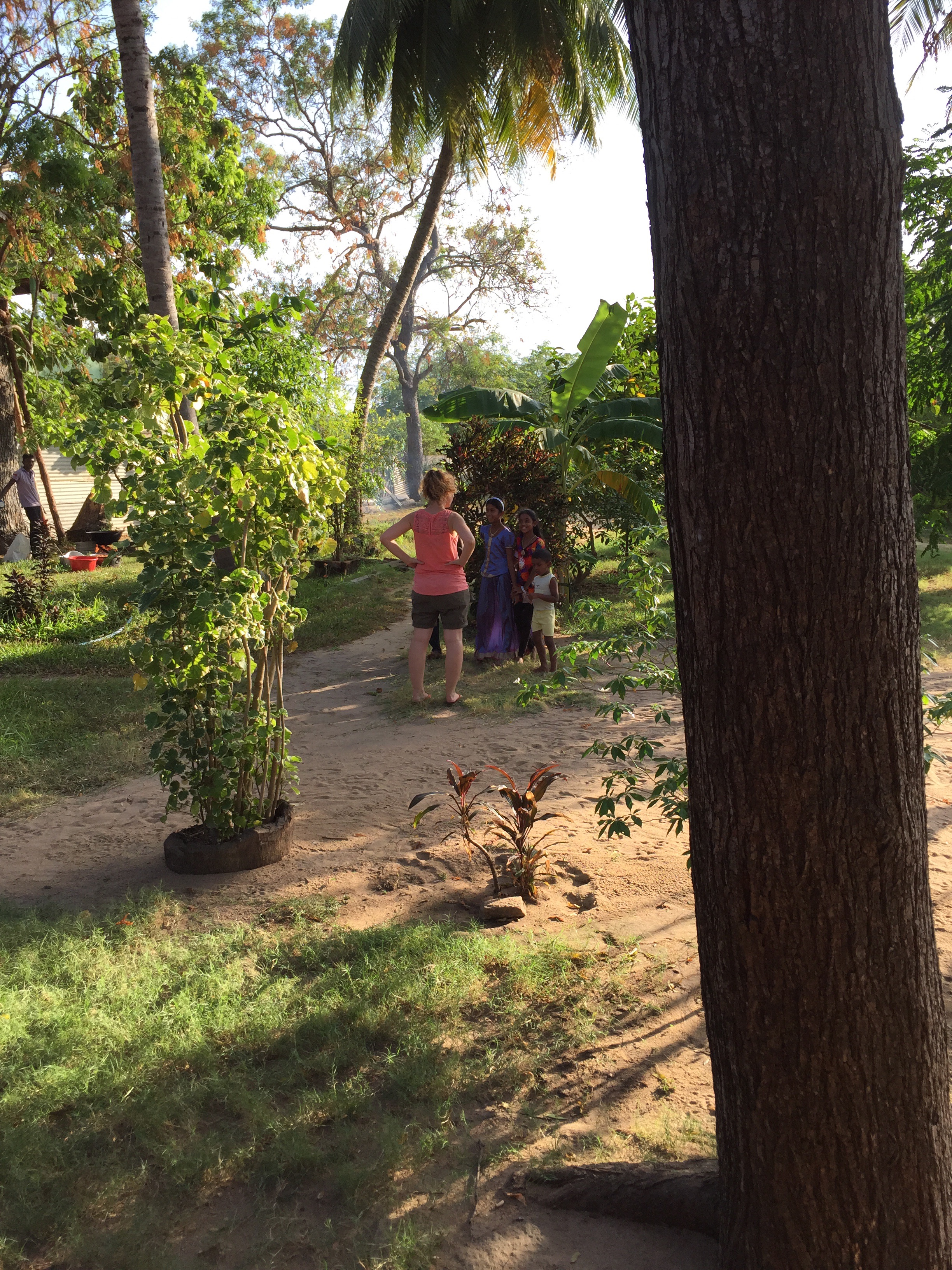 Après la balade en route pour la côte Est et la ville de Passikudah. Arrivés devant la guesthouse qu’on avait repéré on nous installe au fond du jardin dans un petit bungalow avec douche à ciel ouvert, le top ! On trouve étrange d’être les seuls touristes et lorsque le boss arrive il nous confirme qu’ils sont normalement fermés car c’est la Poya – fête bouddhiste de la pleine lune, et qu’ils ne font pas non plus à manger pendant 2 jours… Encore une fois on se dit qu’on n’est pas encore de vrais aventuriers bien renseignés !!! Mais du coup on est accueillis par toute la famille qui nous offre à manger le plat traditionnel, le Rice and Curry et nous invite même à venir à la fête plus tard dans la soirée. Pendant ce temps on les observe, ils cuisinent dans le jardin dans des grandes marmites pour tout le temple, les enfants viennent nous voir et jouent à cache-cache, tout le monde est heureux et on se dit que finalement on a bien fait de venir ce jour là (Rose Marie on a eu une grosse pensée pour toi car on se sentait comme dans ta maison). Arrivés à la fête bien entendus on est les seuls Européens mais personne n’est choqué de nous voir (ça nous fait réfléchir sur certains sujets délicats comme le racisme et la religion car ici tout le monde cohabite gentiment), on s’assoit un moment avec un papi qui nous explique que depuis le tsunami de 2004 c’est la première fois qu’ils peuvent refaire la fête dans ce temple, il nous amène regarder la cérémonie et on fini la soirée à prendre les enfants en photo. Ils nous font prendre des tas de pauses avec eux, leurs parents, et ils sautent de joie quand on leur montre les photos sur notre appareil. Une soirée parfaite avec des gens si souriants et accueillants en voilà le résumé. Le lendemain on marche un long moment pour être seuls sur la plage à l’ombre d’un cocotier (difficile à trouver car la solution est de louer un transat dans un hôtel de luxe) et surtout de pouvoir se mettre en maillot pour Androu car les Sri Lankais se baignent habillés donc on ne veut pas les choquer ! La journée se termine autour de quelques beignets achetés dans la rue (les Sri lankais se reposent donc aucun Resto ouvert sauf encore une fois dans les supers hôtels) et comble du luxe nos hôtes nous offrent des bananes on est refait !!!