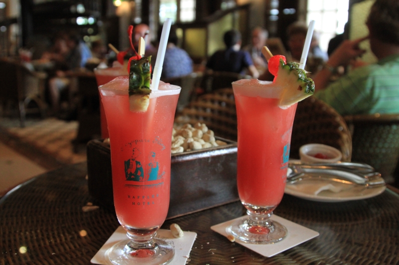 – Boire un célèbre Singapour Sling, cocktail à base de Gin, Cherry Brandy, Bénédictine, Cointreau, une larme de jus d’ananas et du citron vert, dans le bar du tout aussi célèbre Raffles Hôtel.