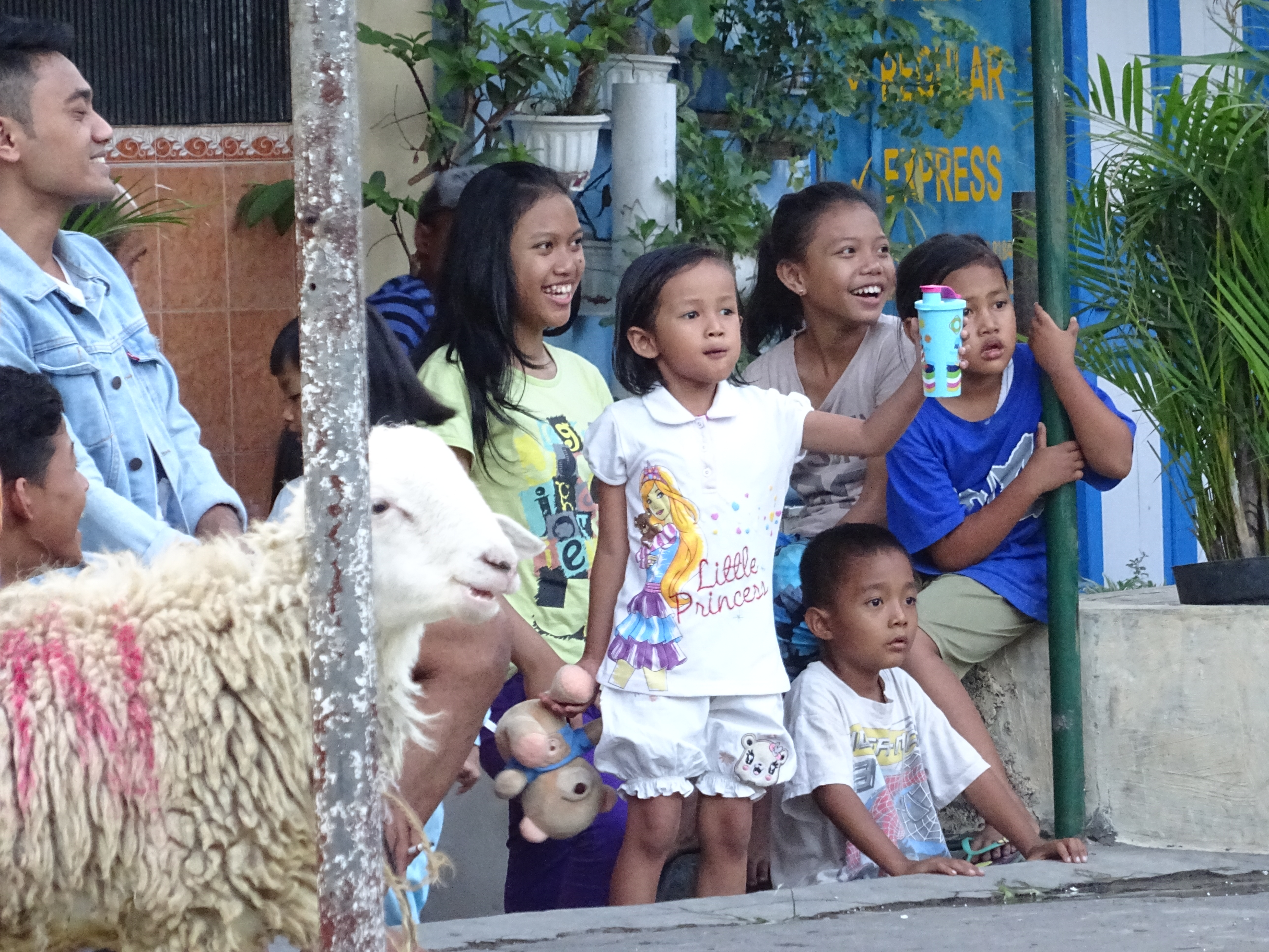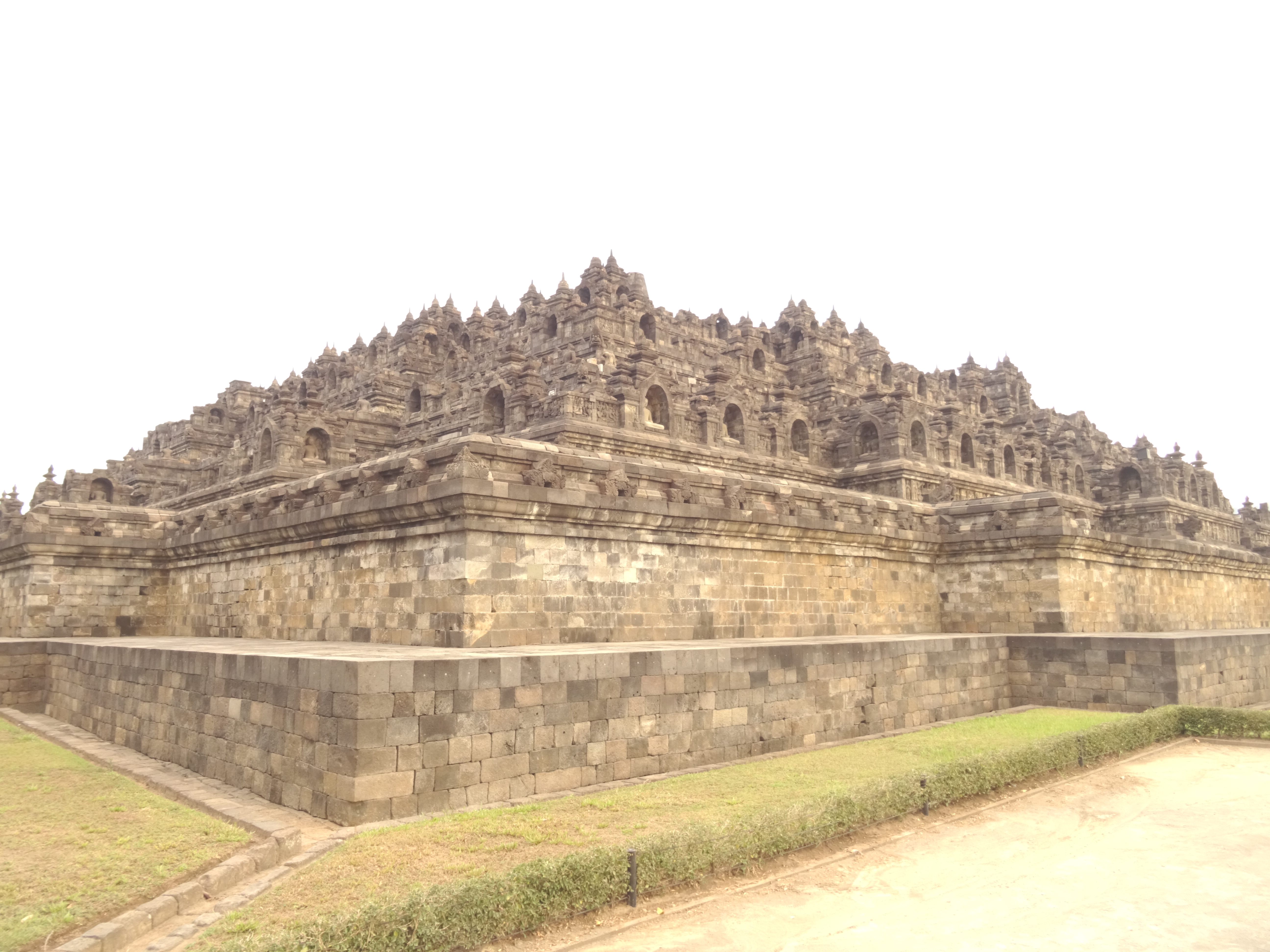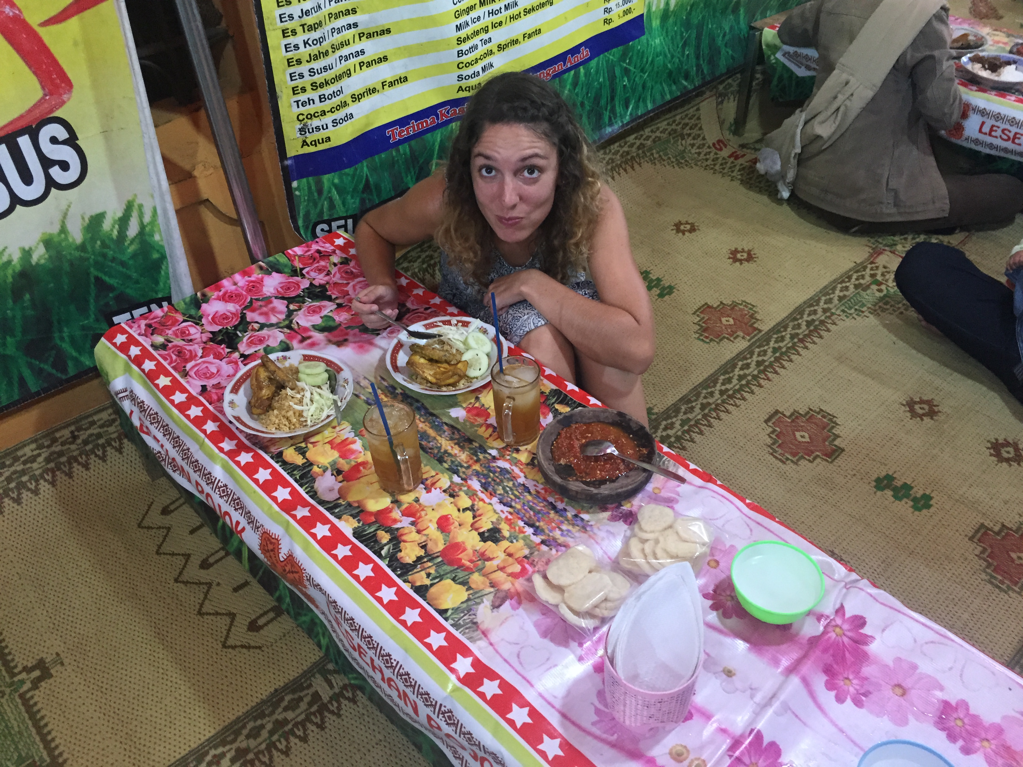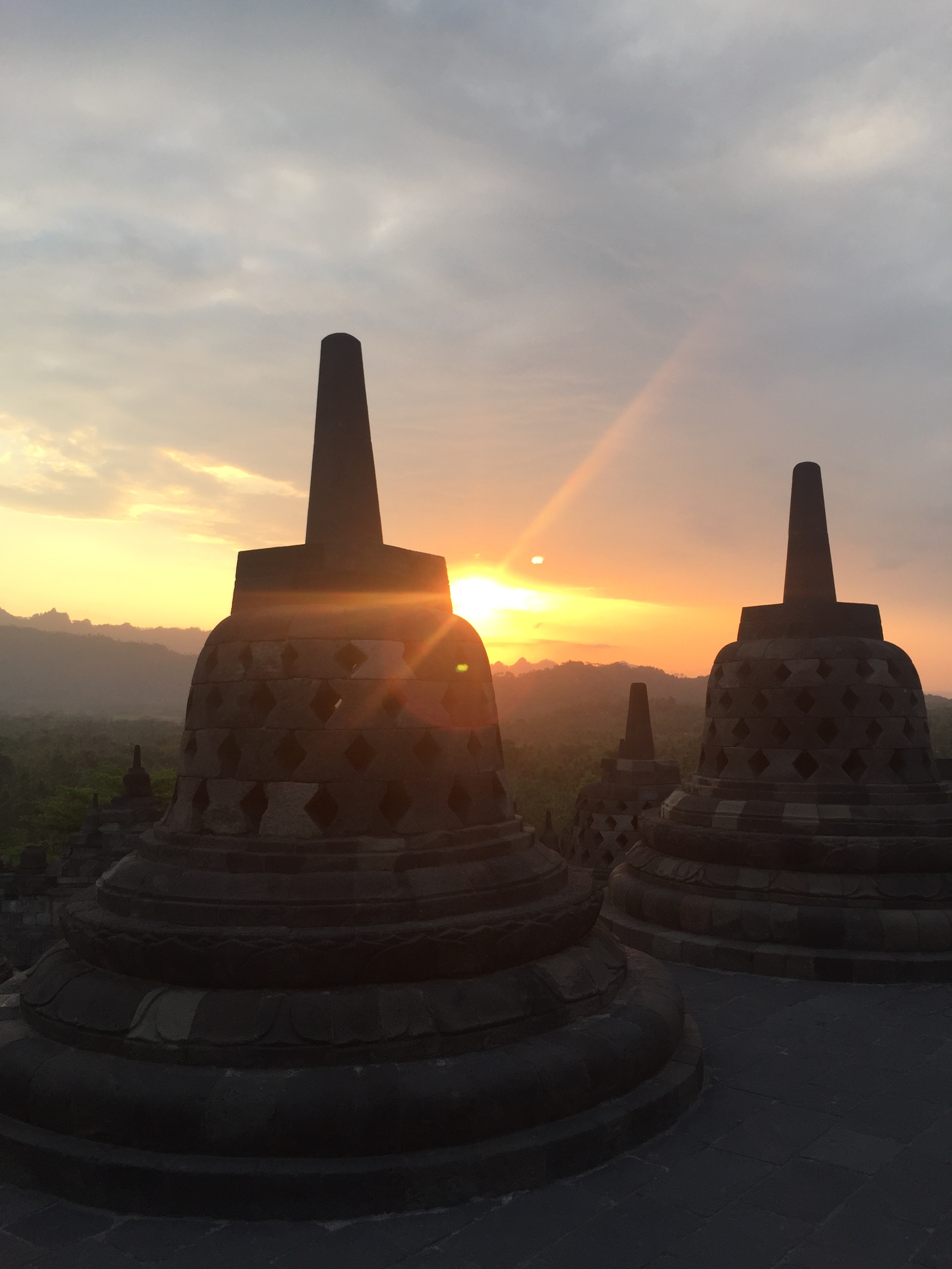 Le lendemain on décide que la journée sera consacrée à préparer notre itinéraire et c’est pas une mince affaire tellement il y a d’îles, offrant toutes quelque chose de différent. Une partie de l’après midi sera aussi dédiée au repos ! Le soir, repas dans la rue attablés avec les locaux, ils adorent discuter avec nous et on goûte aux premiers moments de gloire car ils aiment aussi nous prendre en photo ! C’est bien reposés que nous nous levons de bonne heure le lendemain matin en direction de Borobudur, le plus grand temple bouddhiste du monde pour l’affronter à la fraîche et voir le lever du soleil. On attend le bus longtemps, longtemps, il commence à faire chaud, et puis on se rend compte que les bus ne partent qu’à 10h ce jour là, alors changement de plan on ira en fin d’après-midi pour le coucher du soleil ! Comme à notre habitude maintenant, on est venus au moment de l’Aïd, ou « fête du sacrifice », une grande célébration musulmane, du coup de nombreuses boutiques sont fermées et services annulés ! Mais au moins c’est la java (ah ah) et on loge dans un quartier animé à côté de la mosquée, des familles et des moutons pour l’instant vivants !!! Dans l’après-midi on arrive finalement au temple, il fait bon, pas trop de monde, il n’y a plus qu’à attendre le coucher du soleil. Le site est vraiment superbe, l’architecture est totalement différente des grands temples déjà visités, tout en pierre volcanique et en forme de cloche, on en prend plein les yeux ! En rentrant en ville on ira dîner par terre avec les locaux, le concept nous plait bien et le dîner aussi, ça sera comme d’habitude un Nasi Goreng : riz et poulet.