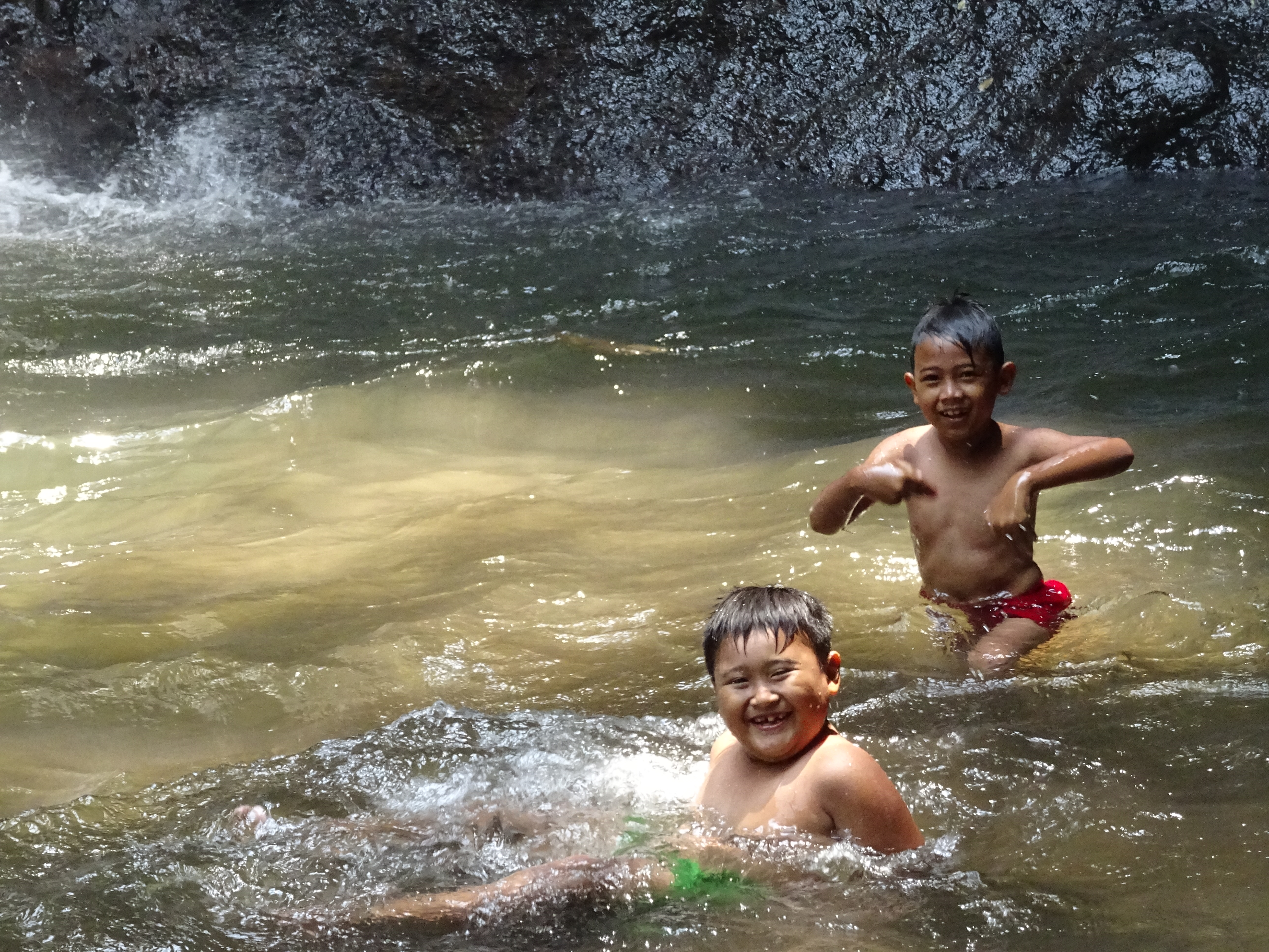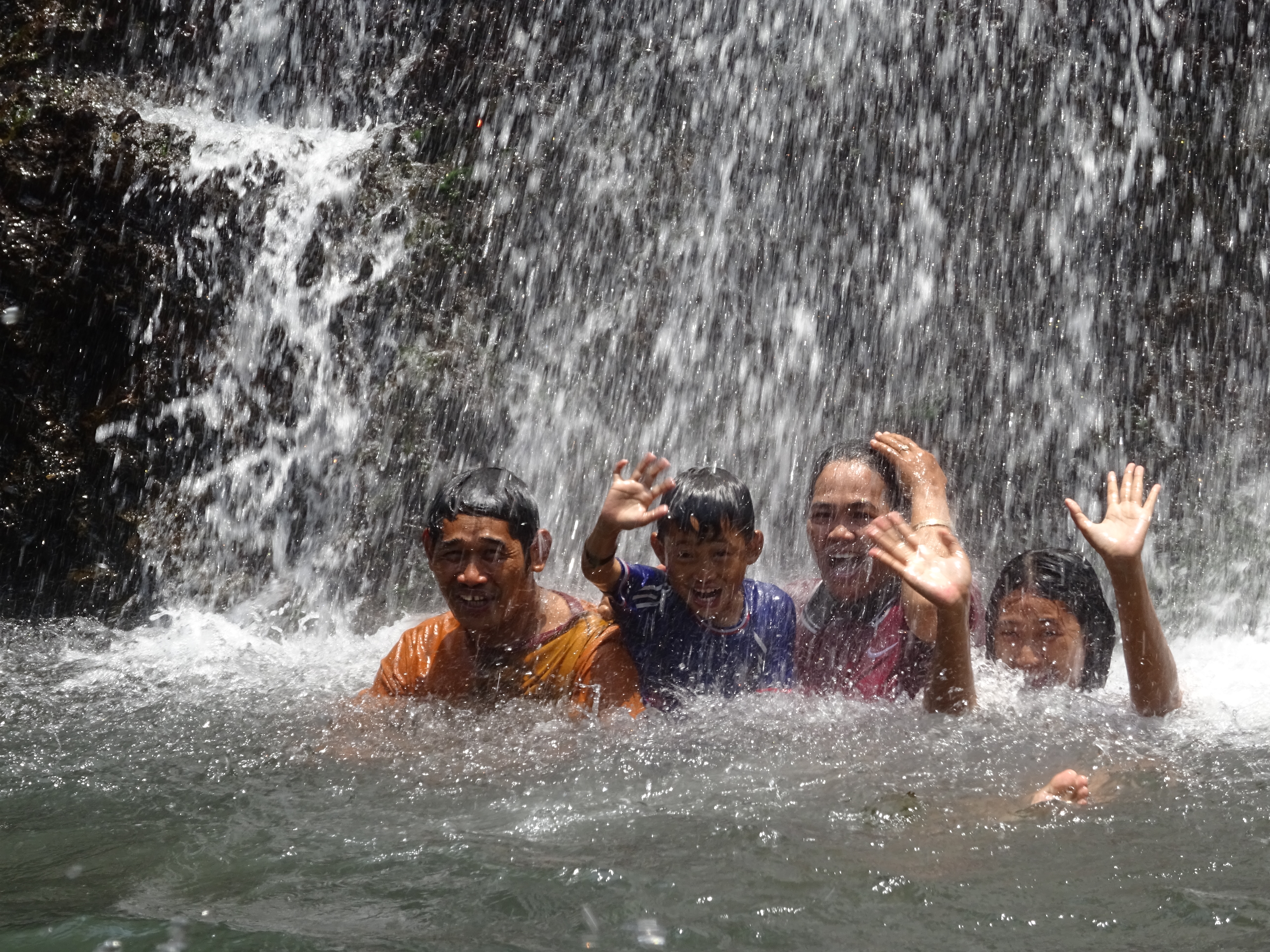 On part ensuite en Jeep avec un ami à lui à la découverte de leur magnifique région. Premier arrêt à une cascade, nous sommes dimanche il y a du monde partout, on est les deux seuls occidentaux ça va être encore de longs moments de gloire pour nous, et Androu va toucher beaucoup de ventres de femmes enceintes, c’est une tradition ici car elles souhaitent que leur enfant ai la peau claire comme nous, ah ben mince moi qui pensait être bronzée !!! Chung nous fait déguster quelques spécialités locales et on continu vers les plantations de café Robusta et Nescafé (tenues par des compagnies chinoises), de caoutchouc, de clous de girofles et pour finir de cacao. On dégustera de l’eau de coco bien fraîche devant les rizières, un spectacle saisissant et on testera même de goûter la fève de cacao, une délicieuse découverte !