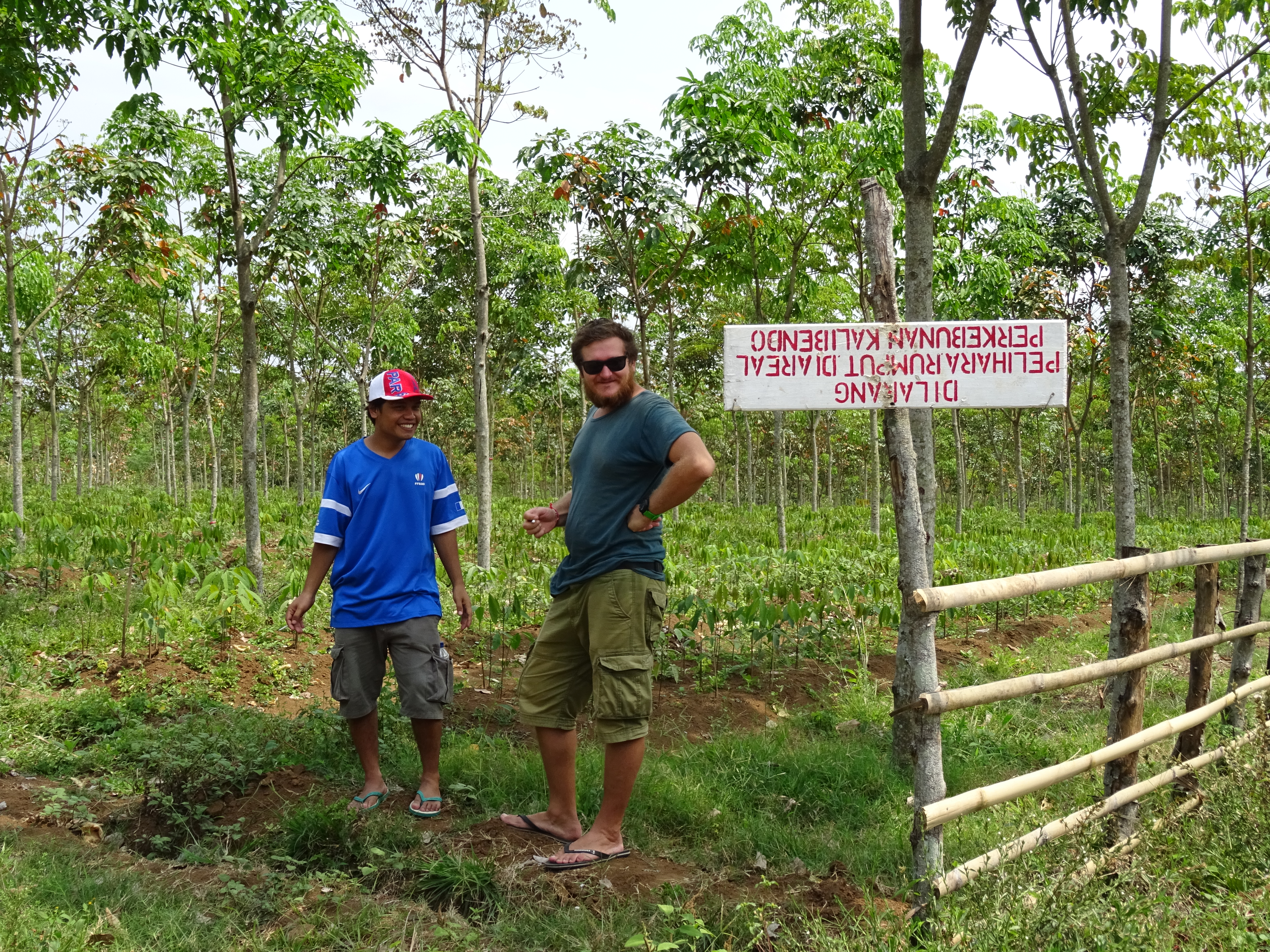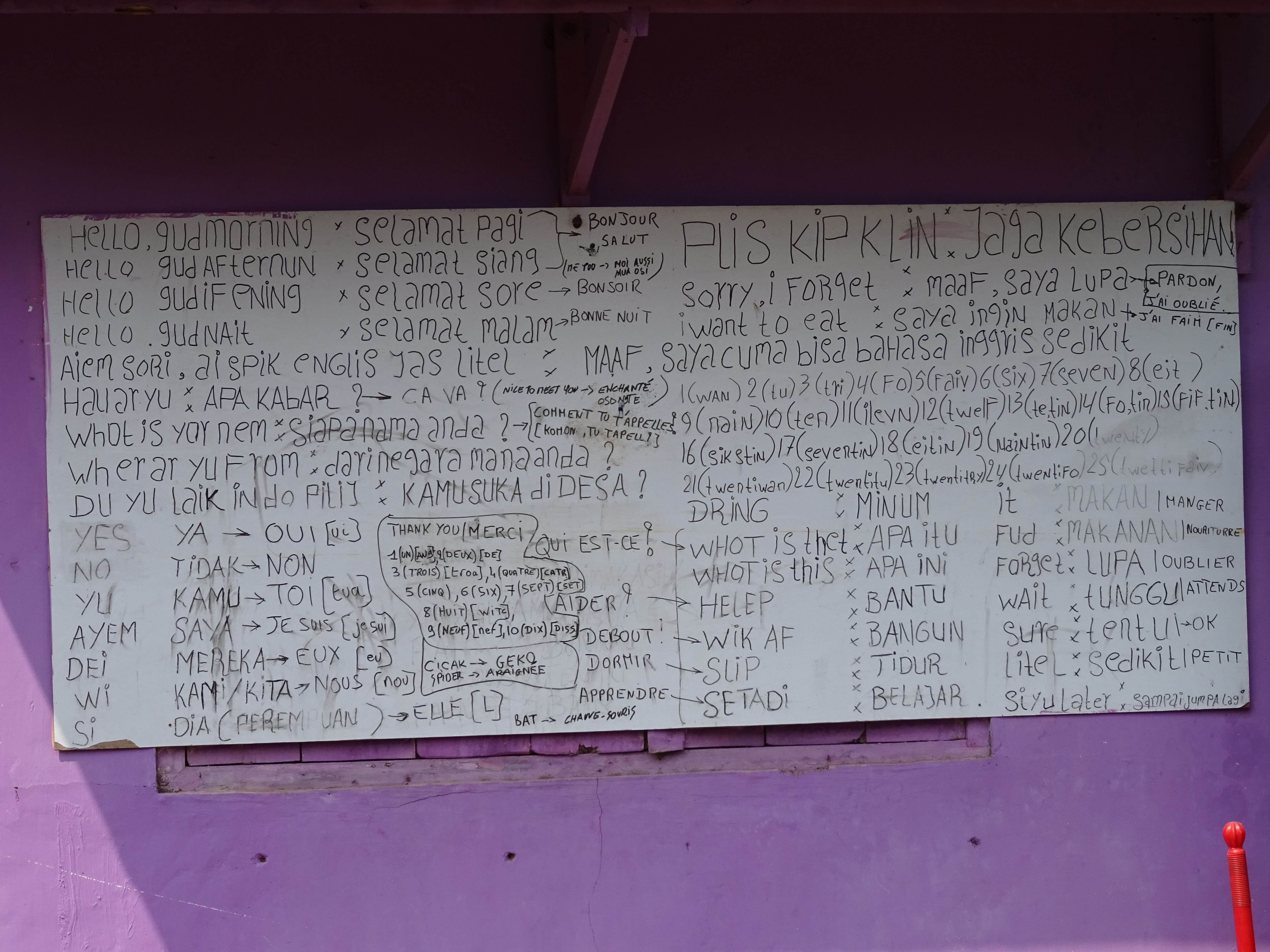 Paing et sa femme viennent nous chercher à la gare vers 21h et nous conduisent à leur maison sur une route ou plutôt un chemin caillouteux à bord d’un Espace, ça secoue ! Sur le mur de la maison ils ont créé un tableau avec des phrases en indonésien traduites en anglais et en français pour que tout le village puisse apprendre. La femme de Paing nous fait à manger pendant qu’on discute avec son mari de leurs conditions de vie. Lorsqu’ils n’accueillent pas de touristes les hommes vont travailler au volcan qui est en fait une mine de souffre et les conditions de travail sont absolument lamentables. Paing nous conseille d’aller nous coucher pour être en forme les 2 prochains jours, ça sera donc notre 3ème jour sans douche, dur ! On doit être prêt pour 10h le lendemain donc on met le réveil assez tôt pour la mission douche, qui est très rudimentaire mais eux se lavent à la rivière donc ils doivent trouver leur « salle de bain » luxueuse ! Après un petit déjeuner très copieux on fait la connaissance de Chung, qui va nous accompagner pendant 2 jours. Il nous amène se balader dans son village et dans les rizières au bout de la « rue ». On fait une première pause pour discuter et ces moments sont extraordinaires, on peut échanger sur absolument tous les sujets. Chung est donc étonné d’apprendre que nous venons de petits villages comme le sien sauf que nous avons une route et internet, il pensait qu’il n’y avait que des buildings en France. Il nous amène ensuite dans sa maison pour nous présenter ses bébés de 24 jours seulement, des jumeaux, une attraction au village, un bonheur pour lui mais qui le contraint à travailler encore plus dur. Étant absolument fan de la France un de ses fils s’appelle Paris ! Il nous offre un thé et nous fait écouter les chansons françaises qu’il apprécie notamment Alain Bashung, Lara Fabian et Dalida, mais quelle ne fut pas sa peine quand on lui a appris qu’elle était morte, oups !