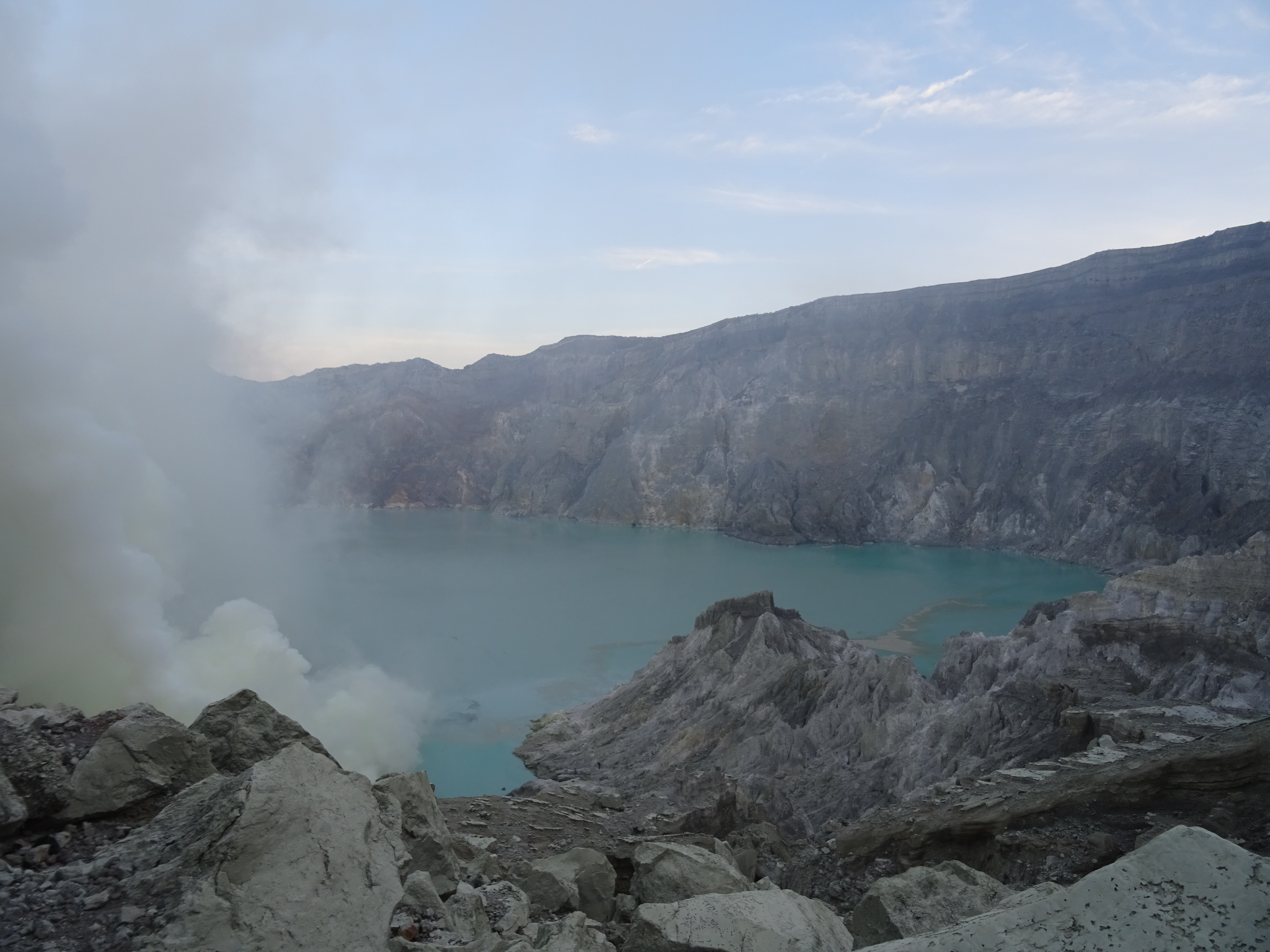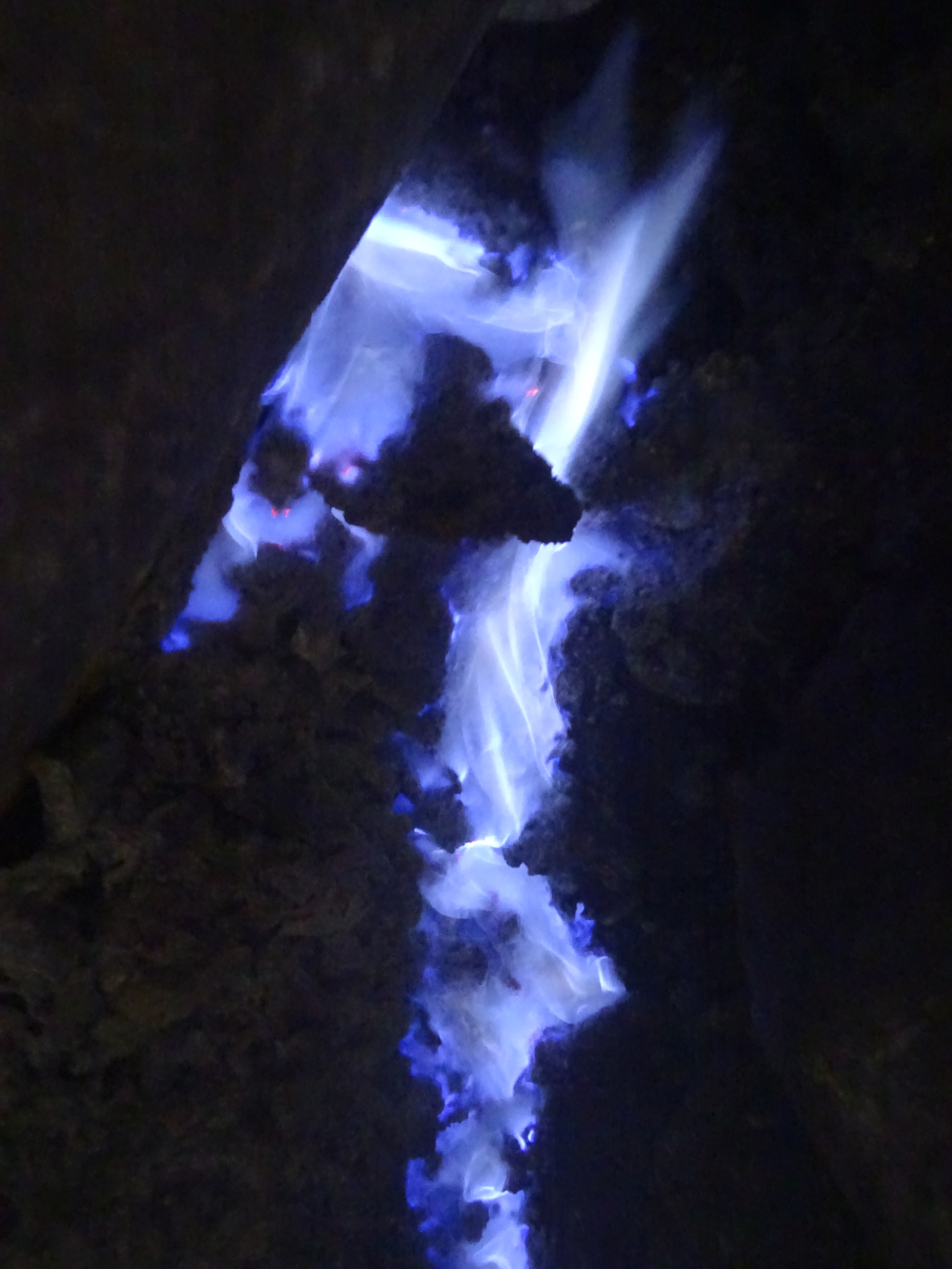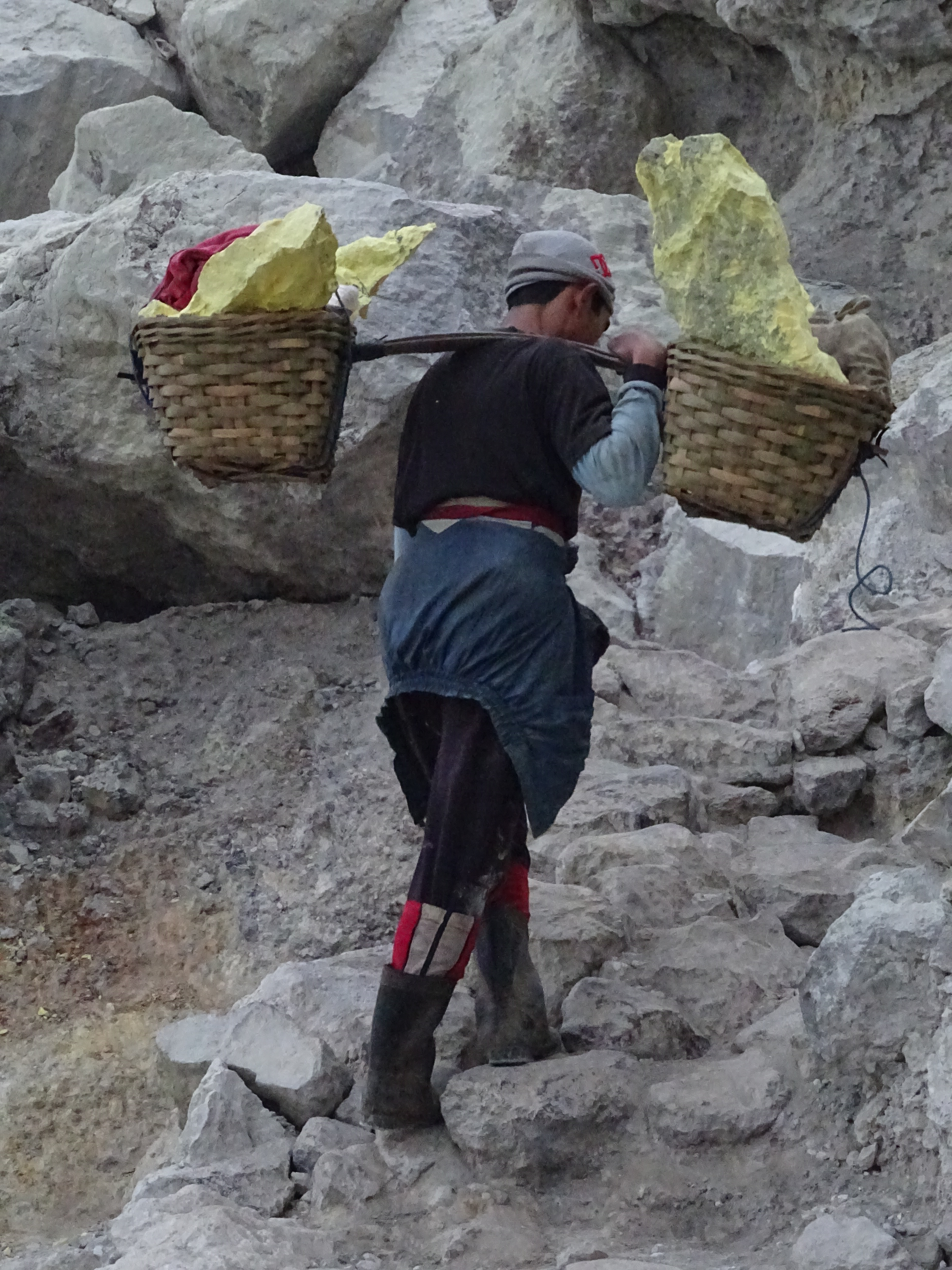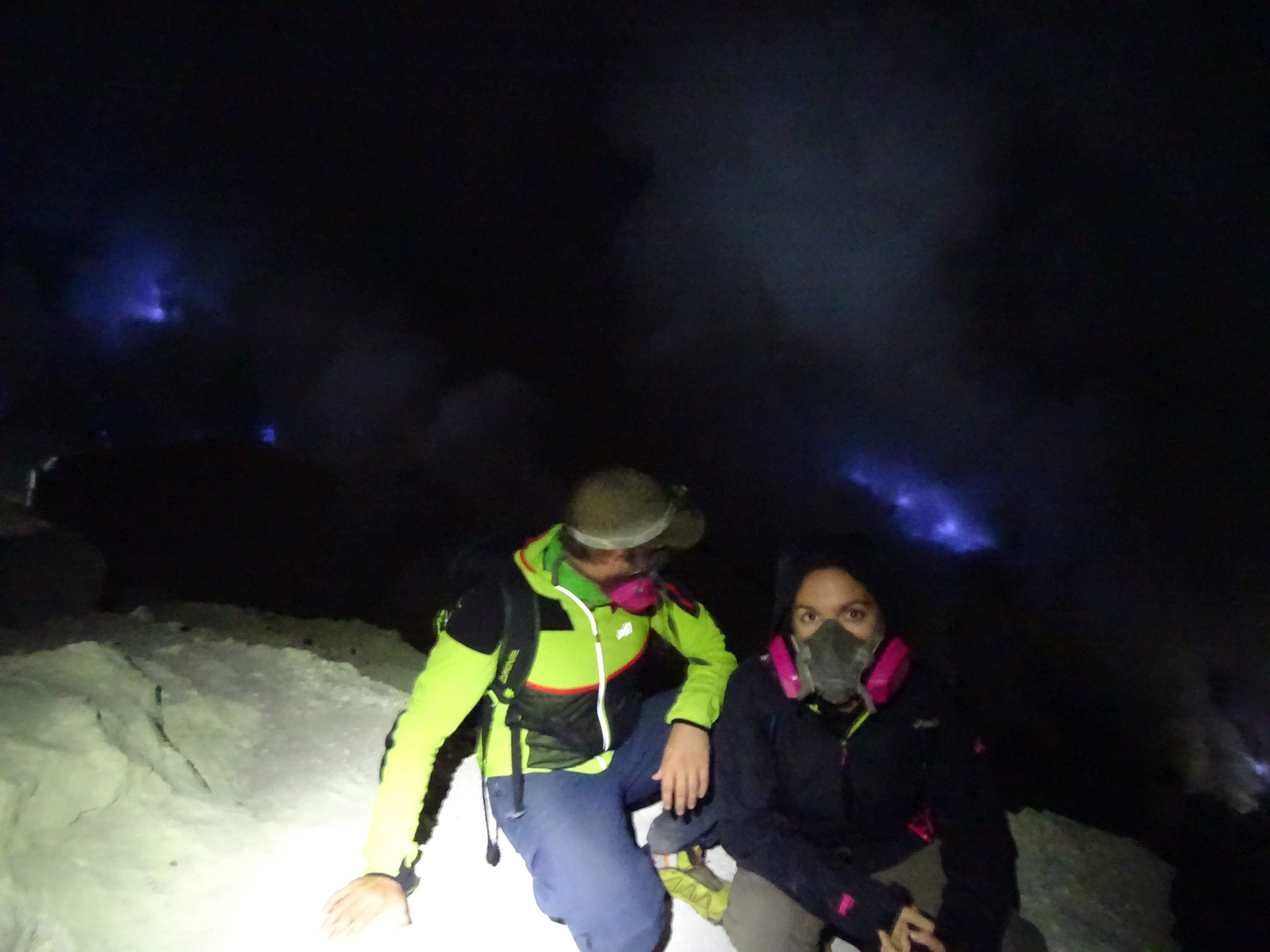 La montée de nuit se fait rapidement jusqu’au sommet, on s’équipe de masque à gaz et on ne traine pas pour descendre dans le cratère, Chung sera très rassurant avec nous et il me donnera la main tout le long. Une fois en bas on découvre les flammes bleues, ce pour quoi il est principalement connu, un phénomène chimique complexe, et un très beau spectacle mais ce qui est beaucoup plus saisissant c’est le travail des mineurs, on en a les larmes aux yeux. Ces hommes travaillent pour une compagnie chinoise qui les exploitent totalement, les rend même au titre d’esclave pour nous. Les porteurs de souffre chargent dans des paniers à balanciers plus de 60 kilos de souffre qui a jailli à plus de 120 degrés puis s’est refroidi. Ils font entre 2 et 5 voyages par jour soit 15 kilomètres à chaque fois pour un salaire des plus dérisoires. Il travaille en général 10 jours et rentrent ensuite chez eux 10 jours. A tour de rôle ils dorment dans le cratère pour surveiller les flammes et la dangerosité des gaz. Le père de Chung a déjà eu un grave accident qui l’a contraint à se rendre à l’hôpital – ils se soignent en général avec des massages, des potions et des prières – et ça lui a coûté très cher n’ayant pas d’assurance. Comme nous a dit Chung, ils n’arrêtent pas ce travail pour leur retraite mais pour leur mort, ça nous a glacé. Aucune installation moderne pouvant les soulager et rendre leur travail plus sécurisant n’est envisagée. Ils ont déjà fait grève mais la nécessité d’un salaire les a vite rattrapé. Le souffre est utilisé principalement pour le raffinement du sucre mais aussi pour la cosmétique… On va rester au fond du cratère un long moment, le soleil se lève et on aperçoit beaucoup mieux le lieu, le lac vert au milieu du cratère s’est même mis a bouillonné, Chung nous a alors conseillé de remonter par précaution. Au moment de repartir au parking on apercevra une touriste dont on taira la nationalité (vous allez finir par croire qu’on a un problème avec eux) qui a payé 4 mineurs – très cher on l’espère – pour la porter sur une chaise jusqu’en bas, une vraie honte ! Il est temps de rejoindre le village pour prendre notre petit déjeuner et passer nos derniers moments avec eux, un peu tristes de les quitter… Ils nous on donné une très belle leçon de vie, leur devise est « Don’t worry, be happy ! »