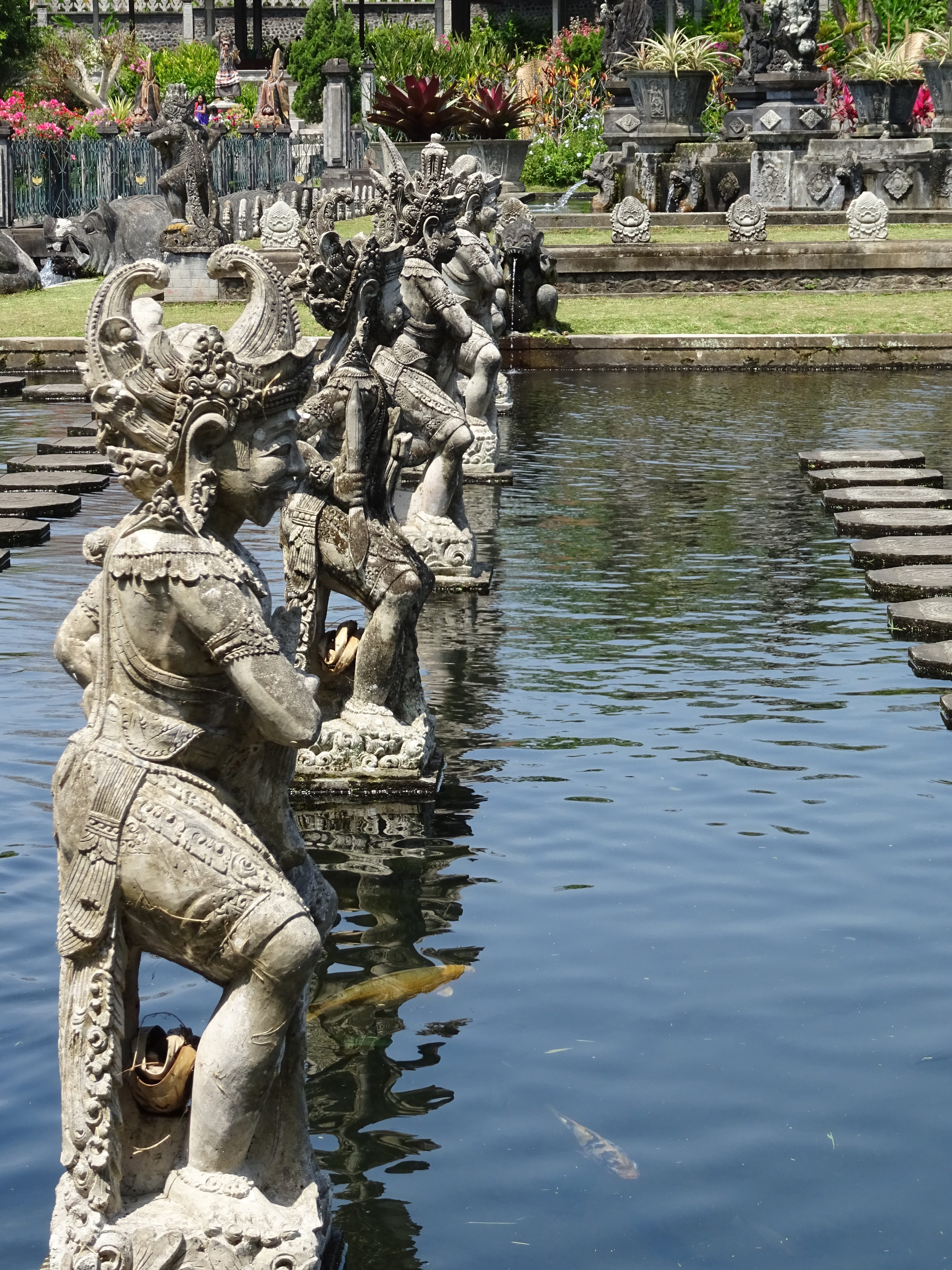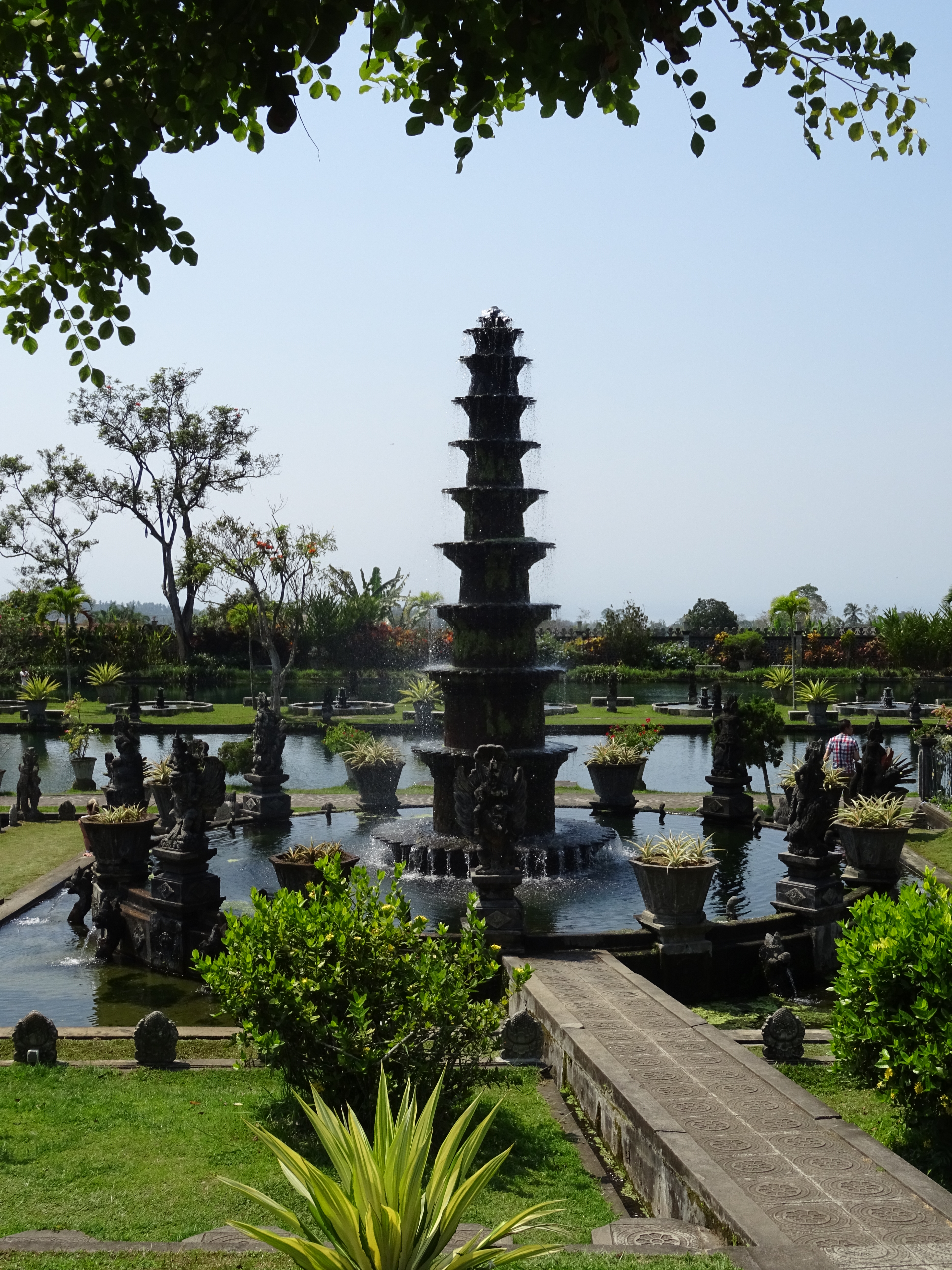 Une petite déconvenue nous aura un peu gâcher notre première journée : on a plus d’argent et on ne peut pas en retirer ! On est partis le matin d’Ubud sans y parvenir, mais on ne s’est pas affolés en pensant trouver un moyen à Amed. C’est loupé, impossible de retirer, alors en véritable gentleman Seb part à pied sous la grosse chaleur pour le village voisin mais le distributeur est carrément éteins, cette fois on est mal ! On se voit déjà coincés là jusqu’à lundi à manger des galettes de riz et devoir appeler les parents pour faire un virement western union… On tente un coup de poker et on claque nos derniers sous pour louer un scooter et partir à la recherche d’un distributeur. Rapidement on comprend que le problème ne vient pas de nos cartes et que nos comptes ne sont pas à 0, mais que les distributeurs sont vides !! Et au bout de plusieurs tentatives et kilomètres ça y est on a des sous, on est même millionnaires (en roupies bien sûr), tant pis pour les frais de retrait et pour les personnes qui font la queue derrière nous, on prend tout ce qu’on peut et on va fêter ça avec une bière et un plus ou moins bon repas ! Le lendemain on met le réveil pour profiter de la journée à fond, on part visiter le Water Palace de Tirtagangga en passant par de magnifiques paysages une fois de plus, au retour on ira observer les fonds marins devant notre hôtel avec quelques sessions siestes entre temps ! Pour l’apéro et le dîner on retrouvera avec plaisir Anais et Guillaume (rencontrés à Ubud), un moment bien sympa même si le staff nous a mis dehors à 22h à coup de lumière éteinte mais en nous disant gentiment « Vous pouvez rester là si vous voulez. » L’indonésie est vraiment différente des autres pays asiatiques au niveau des horaires, ici ils ne se lèvent pas en même temps que le soleil, les magasins n’ouvrent qu’à 9h et par contre les restos et commerces ferment tôt. A Bali stop aux préjugés car souvent les hommes font des boulots de ménage et les femmes sont sur les chantiers !