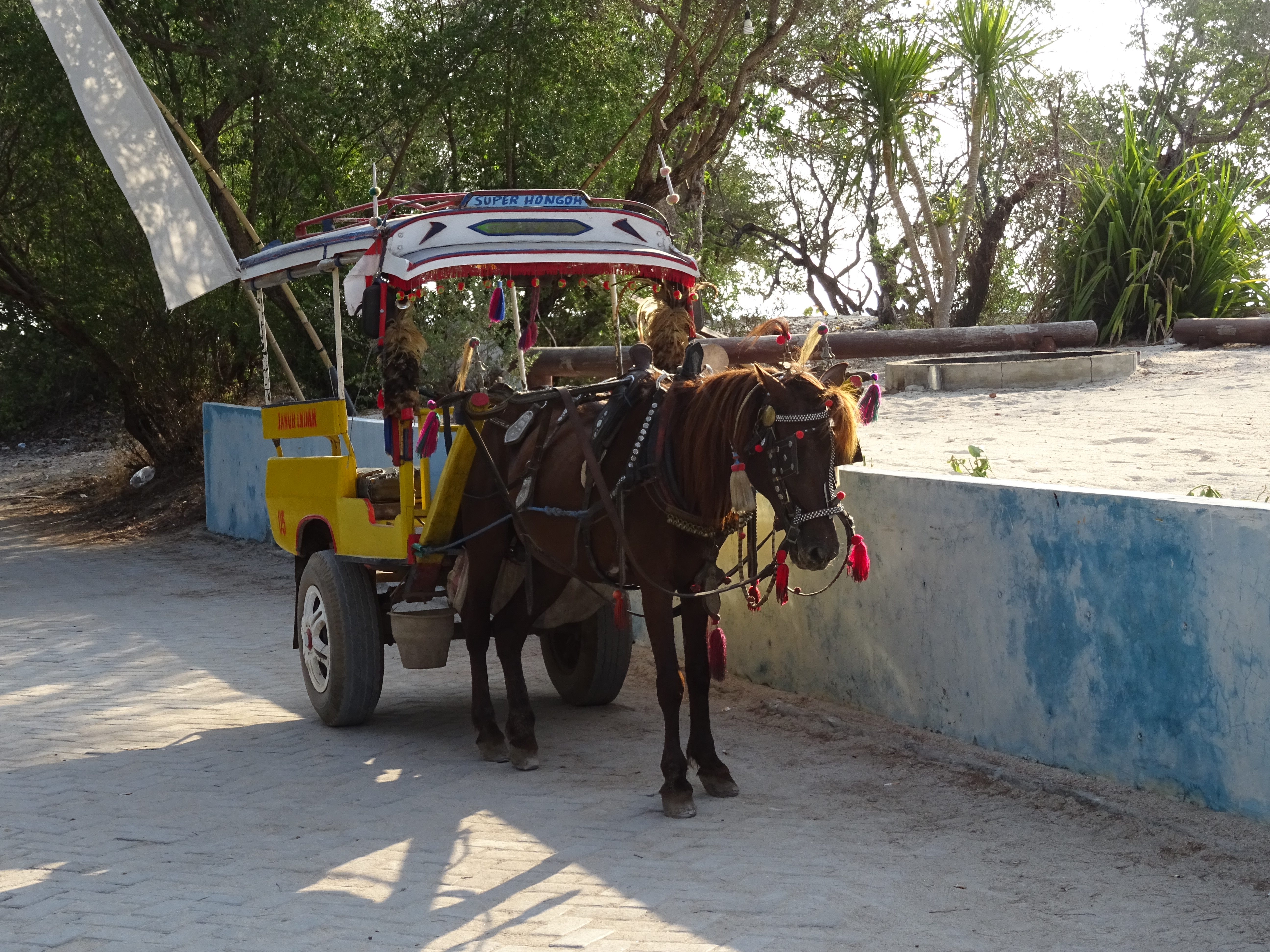 Il est temps de quitter Bali pour rejoindre les îles Gili et plus exactement celle de Trawangan, la plus vaste et animée. Pour y aller on part en bateau rapide, comme à son habitude sur-occupé de touristes, du coup on se retrouve à l’arrière et on va arriver trempés au bout de 45 minutes, mais heureusement pas malade ! Seb en gentleman de nouveau me fait la surprise de réserver 3 nuits dans un super hôtel, vous l’aurez compris les 3 jours vont être relax ! L’île est pour l’instant la plus belle depuis le début de notre voyage, l’eau est limpide, les fonds marins superbes et les constructions ne gâchent pas encore le paysage, certaines sont même de très bon goût. Étant en période creuse l’animation n’est pas du tout gênante, on va plusieurs fois faire le tour de l’île en vélo car ici pas d’engins motorisés juste vélos et calèches, les sorties plongées rythmeront nos journées tout comme les siestes et aussi un bon massage balinais pour finir de recharger nos batteries !