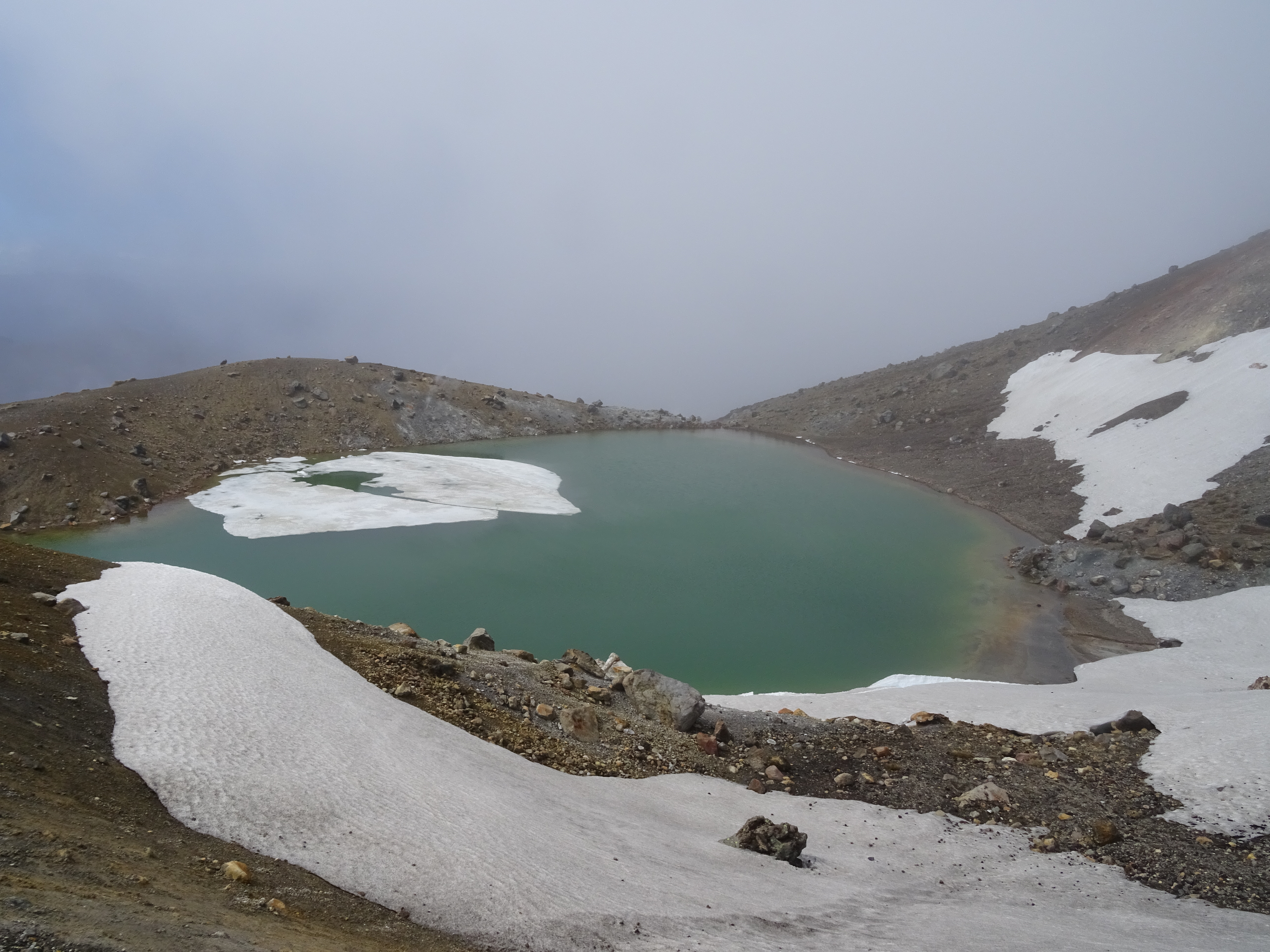 Pour terminer la journée on se dirige vers le parc national du Tongariro, un domaine skiable très fréquenté l’hiver, afin d’être sur place pour effectuer le lendemain une des plus belles randonnées de notre voyage. On dort dans la nature au bord d’une rivière, et on s’allume même un feu pour manger au chaud en compagnie de Christelle et Nicolas un gentil couple de belges avec qui on fera la rando. La nuit va être très fraîche, Vanina s’est bien gelée aussi, on part quand même à 7h avec un franc soleil et une grosse motivation pour une des « Great Walk » du pays. Dans les brochures ils nous mettent bien en garde sur le parcours pour que l’on soit prêt à affronter les 4 saisons en 1 journée et c’est bien ce qu’il va nous arriver ! On commence en automne, doucement mais sûrement le long d’un plateau volcanique, on se rend compte aussi que nos compagnons de rando vont donner le rythme et que l’on va devoir s’accrocher, Nicolas nous parle des marathons, triathlons et des ironmans auxquels il a participé et ça nous calme direct ! Quand vient l’hiver, la grimpette et le froid sont sévères, on marche même un long moment dans la neige, c’est juste incroyable. Pour les inconditionnels du Seigneur des Anneaux, nous venons de traverser le Mordor. Arrivés au sommet le froid et le vent sont à leur maximum donc on ne s’attarde pas et puis c’est tellement brumeux que l’on ne voit rien ! Il y a 2 magnifiques lacs à observer, on les apercevra timidement quand le soleil est passé à travers les nuages quelques secondes. Arrive maintenant la descente et le printemps, on se sent mieux et la vue sur les lacs Rotoaira et Taupo en contrebas est superbe, puis une fois passés à travers une jolie forêt nous voilà au parking, c’est la délivrance et c’est l’été !!! 20kms bouclés en 7h30 ça use, on se fait un petit goûter franco-belge puis nos routes se séparent, on prend la direction de Napier au soleil.