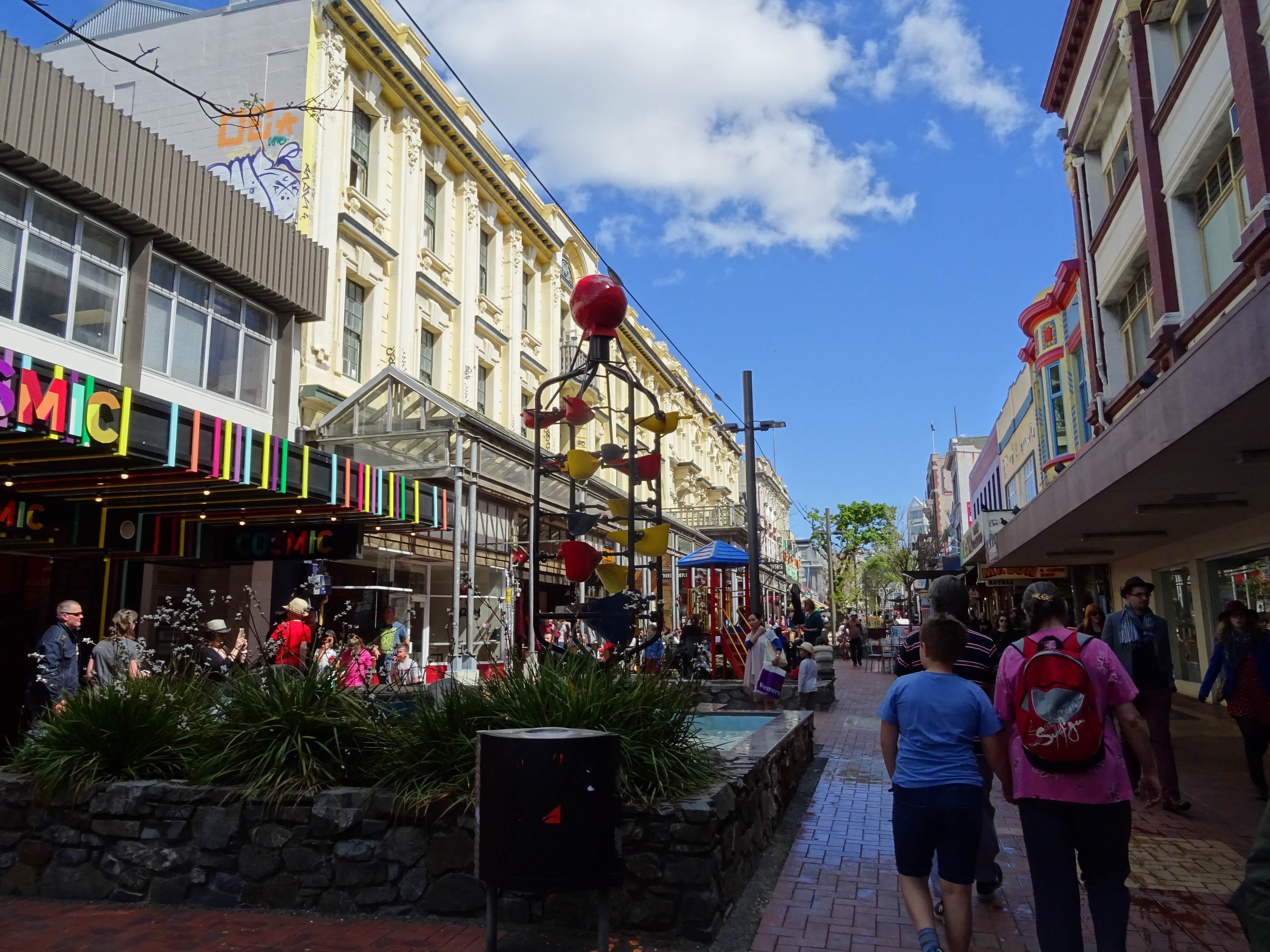 Finalement on met la journée pour rejoindre Wellington et il pleut tout le long de la route, heureusement que les milliers de moutons (pas d’exagération sur le nombre cette fois) sont là pour nous égailler le voyage, on gare Vanina en bord de mer et on attend sagement (on a fait durer le plaisir) notre divin dîner … pain + fromages + rillettes de canard made in France + vin rouge ! Là on a atteint le summum gustatif pour l’instant et on se dit une fois de plus qu’il en faut vraiment peu pour être heureux ! Comme on a 2 jours pour découvrir la capitale néo zélandaise on s’accorde une petite grasse mat’ (on a même pas ressenti le mini tremblement de terre qui a eu lieu dans la nuit) et la météo étant capricieuse on va même se donner un jour de repos, on en avait bien besoin finalement car en voyageant de cette façon on se rend compte que c’est fatiguant. La journée sera donc culturelle puisqu’on a choisi de rester au sec et de se rendre au musée de Te Papa, un endroit que l’on a adoré. L’entrée est gratuite, il y a des animations interactives partout, on peut par exemple rentrer dans une salle et se retrouver comme en plein cœur d’un tremblement de terre, il y a une section sur l’histoire du pays, la culture maorie, la géologie, l’ornithologie (nouvelle passion d’Andréa), j’en passe et des meilleures ! En sortant il pleut toujours mais on se balade un peu dans le centre ville et plus particulièrement à Cuba Street, une rue animée, à la recherche d’un cappucino pour nous réchauffer. Ensuite nouveau moment « culturel » puisqu’on se rend à la bibliothèque, on a envie de lire du Zola en maori… Non c’est une blague, en fait c’est juste parce que c’est le meilleur endroit dans le pays pour être au chaud, avoir du wifi gratuit, installés bien confortablement dans des fauteuils. Avant de regagner notre camping en bord de mer on fait un petit tour au night Market de Cuba Street, cette fois pas de craquage culinaire on se contente juste de regarder les plats de loin et d’écouter une bandas locale. Au moment du dîner quand on déguste à même la casserole (ça fait une sacrée économie de vaisselle !) un mélange pâtes + légumes et poulet au curry en conserve un peu dégoûtant on se dit qu’on aurait peut être dû craquer pour une portion de paëlla au marché finalement !